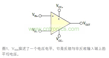 認識VICM還有一種方式,即它是非反相和反相輸入端VIN+與VIN-的公共的電壓電平。在大多數(shù)應(yīng)用中,VIN+非常接近于VIN-,因為閉環(huán)負反饋會使一個輸入端密切跟蹤另一個輸入端,使VIN+與VIN-之間的壓差接近于零。很多共模電路都是這種情況,包括電壓跟隨器,以及反相和非反相配置。這些情況下,通常會假設(shè)VIN+=VIN-=VICM,因為這些電壓幾乎是相同的。