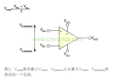 其中,VICMRMIN是相對VCC-電壓軌的極限值,VICMRMAX是相對于VCC+電壓軌的極限值(圖2)。