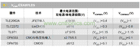 表1是德州儀器公司幾款運放及其VICMR。最大電源區(qū)間欄中描述了雙電源和單電源的極限。表中可以明顯看到,不同運放的輸入?yún)^(qū)間VICMR各不相同。根據(jù)器件的類型,VICMR可能進入或超出電源軌。因此,永遠不能假定某個運放可以接受某個輸入信號區(qū)間,除非驗證了數(shù)據(jù)表中的規(guī)格。
