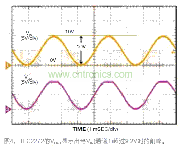 測試電路時,在其輸入端加一個直流偏移為VCC電壓一半(或5V)的300Hz正弦波。調(diào) 節(jié)交流幅度,直到看到VOUT有一個變化。當施加10V峰峰值輸入時,VOUT顯示一個接近正電源軌的削峰信號,而不是接近負電源軌。這個接近正電源軌的不良性能就是預(yù)計輸入超過9.2V時的結(jié)果。對于0~9.2V之間的VIN,VOUT顯示和預(yù)期一樣的正確波形(圖4)。
