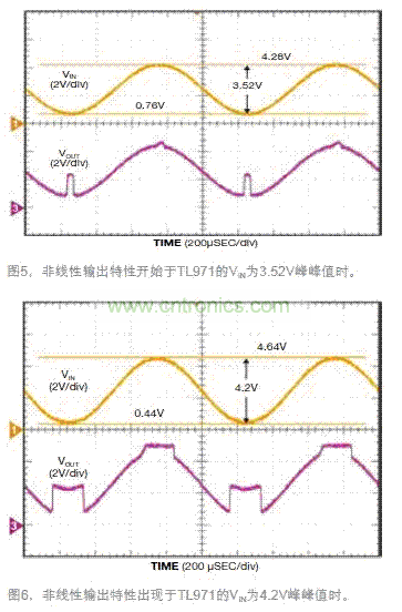 第二個例子使用一只TL971軌至軌輸出的電壓跟隨器電路,但結(jié)果卻不同。此時,運放采用一個單5V電源。從數(shù)據(jù)表規(guī)格可知,有保證的VICMR區(qū)間跨越了1.15V~ 3.85V范圍,或中心在VCC/2的大約2.7V峰峰值。輸入端加的是一個直流偏移為2.5V的1kHz正弦波。將VIN的幅度從200mV峰峰值調(diào)向更高電平,直到看到VOUT的變化。