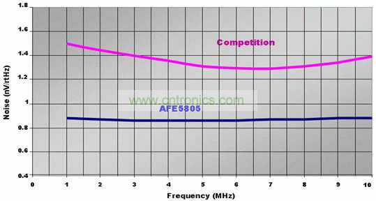 為了滿足上述標準,我們需要一個超聲波 AFE(例如 TI 的 AFE5805)。最為先進的 BiCMOS 和 CMOS 技術用于對功耗和噪聲性能進行優化。由于其低功耗、小芯片尺寸以及較低的閃爍噪聲, BiCMOS 工藝是 AFE5805 VCA 部分的理想之選。CMOS 工藝非常適用于模數轉換器。與同類解決方案相比,這些綜合的創新使尺寸縮小了 50%,功耗降低了 20%,噪聲減少了 40%。圖 2 所示的恒 定噪聲性能涵蓋了整個工作頻率范圍。因此,我們設計的便攜式超聲波系統,可以實現卓越的圖像質量以及最低的功耗。