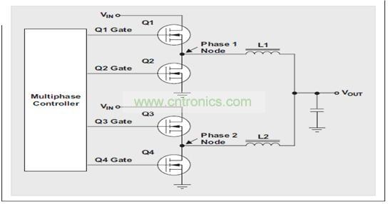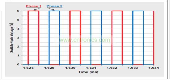 圖1 顯示了一款二相電路。由該電路的波形(圖2 所示)可以清楚地看到各相互相交錯。這種交錯可減少輸入和輸出紋波電流。另外,它還減少了印刷電路板或者某個特定組件上的熱點。實際上,二相降壓轉換器讓FET 和電感的RMS-電流功耗降低了一半。相交錯還可以降低傳導損耗。
