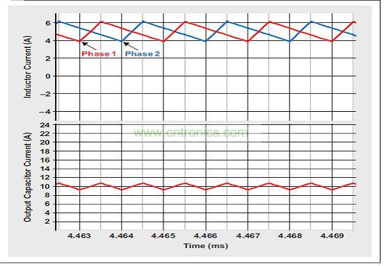 圖4 顯示了25% 占空比下一個二相降壓轉換器的仿真結果。電感紋波電流為2.2A,但是輸出電容器電流僅為1.5A,原因是紋波電流抵消。50% 占空比下使用二相時,電容器完全沒有紋波電流。