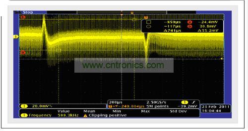 圖10 瞬態響應:10-A負載步長20 µs(過沖/下沖約27 mV)