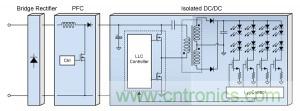 圖 5 以 PFC 輸入級和 LLC 拓撲展示了高壓驅動器概念。 PFC/LLC 結合最高可產生 92% 的效率。 對于一個 400W 的 LED 驅動器,意味著 32 W 的熱損耗。
