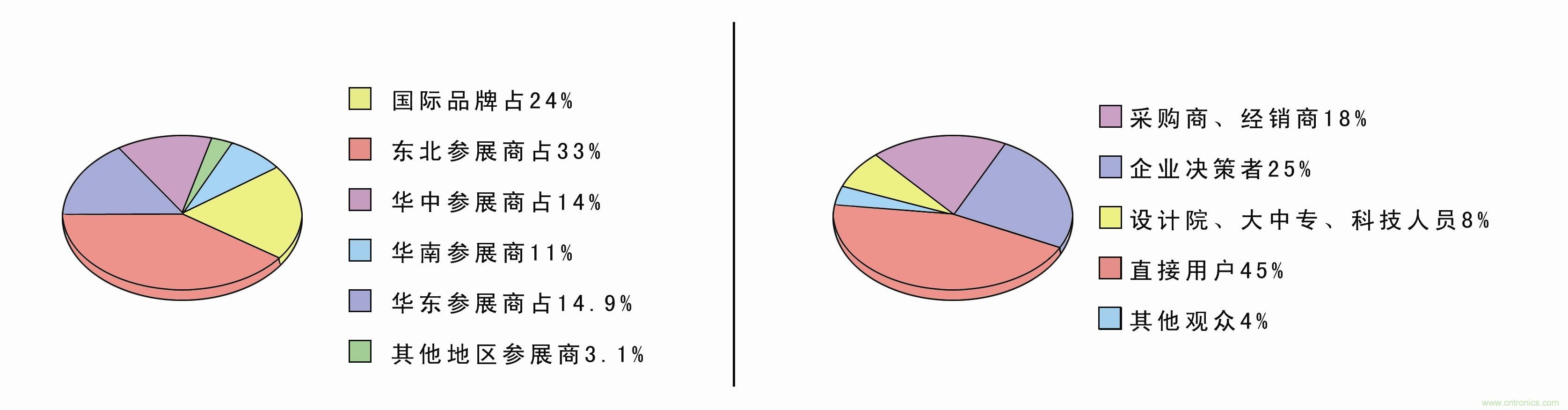上屆展會于2012年5月16-18日在大連星海會展中心舉行,展會規(guī)模已達(dá)一萬多平方米,四百多個展位。世界知名的廠商:西門子、ABB、施耐德、三菱電機、奧托尼克斯、歐姆龍、LG、艾默生、寶帝、威圖、米思米、町洋機電、匯川等企業(yè)齊聚一堂,美國、日本、韓國等國外展團(tuán)的大量參與,使展會更具吸引力;展會的觀眾主要來自東北、華北、華東、華中、西北、臺灣、香港及日本、韓國、俄羅斯等地,其主要為相關(guān)行業(yè)的決策人士、技術(shù)人員及采購負(fù)責(zé)人。本屆展會為切合您的需求,直接面向?qū)I(yè)買家、進(jìn)出口商、分銷商、代理商和直接用戶,為您締造更多的商機!此次展會有參展商三百多家,參觀商兩萬余人,其中各占比例如下: