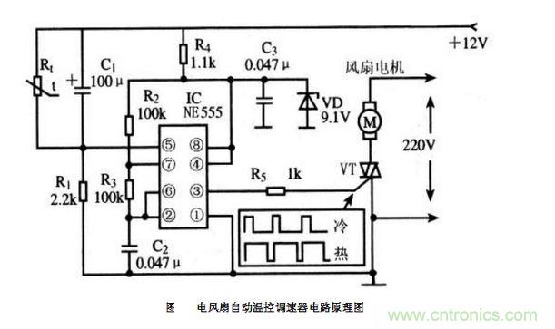 電路工作原理:圖中IC是555時基電路,與R2、R3和C2等元件構成多諧振蕩器,可發出占空比可調的矩形波信號。當溫度變化時,熱敏電阻的阻值發生變化,改變多諧振蕩器輸出方波的占空比,調節雙向晶閘管VT的導通角,從而改變風扇電極兩端的電壓,自動調節電風扇的轉速。元器件選擇 集成電路IC選用NE555時基電路,也可使用LM555和TLC555等型號。VT為雙向晶閘管,其耐壓應在400V以上,額定電流應根據所控制的電風扇容量來合理選用。電阻R1~R5可選用普通1/8或1/4W碳膜電阻器;Rt為負溫度系數熱敏電阻,可選常溫下阻值為10KΩ左右的熱敏電阻。電容C1選用普通鋁電解電容器;電容C2和C3選用滌綸電容器。VD為穩壓值為9.1V的穩壓二極管。