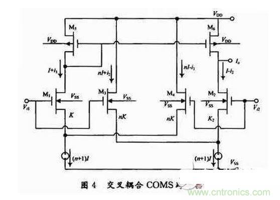 本文采用經(jīng)典的交叉耦合差動式COMS跨導(dǎo)器,其I/V傳輸特性有理想的線性關(guān)系。圖4中,M1和M2偏置電流為I;M3和M4偏置電流為 nI。電路設(shè)計中,M1~M4有相同的溝道長度L,M3,M4的溝道寬度W=nL。設(shè)Y1=i1/I,Y2=i2/I,X=Vid/Vb,則: