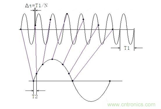 可以看到,等效采樣方法在輸入信號一個周期內(nèi)僅采樣一個點且每個周期采樣的相位有遞增關(guān)系(圖1中△t),調(diào)整這個遞增相位可以達(dá)到調(diào)整相位分辨率的目的。