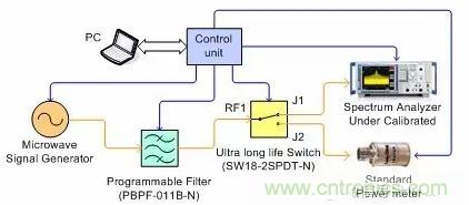 在圖1中,微波信號(hào)發(fā)生器所產(chǎn)生的信號(hào)經(jīng)過一個(gè)可編程的帶通濾波器到達(dá)一個(gè)SPDT微波開關(guān)的輸入端(RF1),開關(guān)的二個(gè)輸出端J1和J2分別接需要被校準(zhǔn)的頻譜分析儀和標(biāo)準(zhǔn)功率計(jì)。在校準(zhǔn)測試過程中,功率計(jì)讀一次來自信號(hào)源的幅度后,開關(guān)即刻切換到頻譜分析儀,并記錄頻譜分析儀針對信號(hào)源幅度的讀數(shù)。