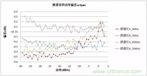 從上述測試結(jié)果我們發(fā)現(xiàn)Span的變化對頻譜分析儀A的幅度誤差影響較小,但測試功率變化時(shí)則產(chǎn)生了較大的誤差。而頻譜分析儀B針對不同的測試功率有著較好的精度,Span的變化卻導(dǎo)致了約0.4dB的誤差。