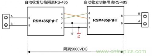 RS485的應(yīng)用中,有時(shí)需對(duì)信號(hào)進(jìn)行增強(qiáng),或不同的RS485網(wǎng)絡(luò)之間進(jìn)行電氣隔離,輸入和輸出都是RS485信號(hào),此時(shí)需用到RS485的中繼器。而基于RSM485系列,可快速搭建簡(jiǎn)易的隔離型RS485中繼器,如圖2 和圖3所示。