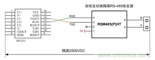 圖 4 簡(jiǎn)易隔離RS232轉(zhuǎn)RS485方案一