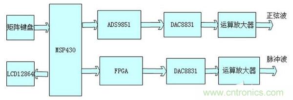 【導讀】本系統以MSP430為控制核心設計并制作一個正弦波和脈沖波信號源。本實驗分為四大模塊,分別是鍵盤掃描模塊,正弦波產生模塊,脈沖波產生模塊和液晶顯示模塊。