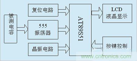 一般元件參數(shù)的數(shù)字化測量是把被測參數(shù)轉(zhuǎn)換成頻率后再進行測量,本設(shè)計采用555為核心的振蕩電路,將被測電容值轉(zhuǎn)化為頻率,并利用AT89S51處理器測量出頻率,再通過該頻率值計算出電容參數(shù)值。