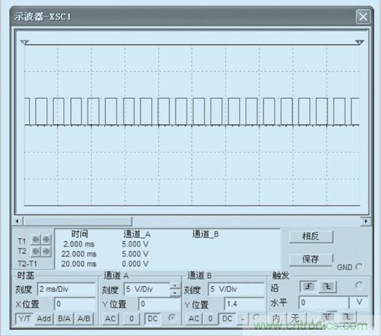 由上式可知,當電路設(shè)計完成后,振蕩器輸出f隨CX的變化而改變。改變R1、R2的值即可改變系統(tǒng)量程。系統(tǒng)量程分為四檔:(1)R1+2R2=470KΩ時,測1.0nF-10.0nF的電容值。(2)R1+2R2=47KΩ時,測10.0nF~100.0nF的電容(3)R1+2R2=4.7KΩ時,測100.0nF~1000.0nF的電容。(4)R1+2R2=470Ω時,測1.0μF~10.0μF的電容。圖3為R1+2R2=470KΩ時,測量電容為2μF振蕩輸出輸出波形。
