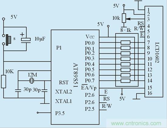 信號處理電路部分采用單片機AT89S51作為系統(tǒng)的主控制器。AT89S51單片機的最小系統(tǒng)由時鐘電路、復位電路、外加電源及單片機構(gòu)成,其硬件電路如圖4所示。555振蕩電路輸出的是脈沖波,接到AT89S51處理器的輸入引腳P3.5,通過AT89S51內(nèi)部定時/計時器T0、T1及相應(yīng)的程序設(shè)計,構(gòu)成一個數(shù)字式頻率測量系統(tǒng),測出頻率后按(5)式運算處理后得到被測電容值。