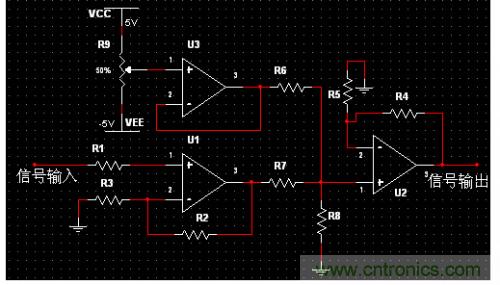 R1,R2分別由一個模擬開關CD4051來連接不同的電阻,不同的R1,R2通過公式:這樣就可以實現程控放大功能了??烧{電阻R9用來設置信號調理電路加入的直流分量的大小。放大后的信號和直流分量最后由U3模擬加法器疊加后輸出。