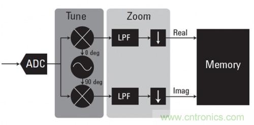 數字化儀采用諸如零抑制(zero suppress)等數據壓縮技術,只保留超過給定閾值的相關信號。它們還使用數據打包和四舍五入來優化可用存儲器空間。也使用諸如數字下變頻(DDC)等實時數據壓縮技術。DDC 直接在 ADC 數據上進行數據的頻率轉換和抽取。圖 3 中的框圖顯示了其基本原理。捕獲到復雜的 IQ 數據,可以使中心頻率下變頻到 0 Hz。然后使用濾波和數據抽取來去除不需要的頻率分量,縮減所需數據的大小。在對寬帶采集中的一小段頻譜進行分析時,DDC 非常有價值。DDC 不僅可以減少所需的存儲空間,而且可以降低寬帶綜合噪聲,改善整體信噪比(SNR)。