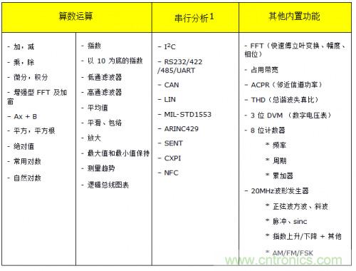 ·測量和分析。示波器針對易用性和測量速度進行了優化。它們的硬件中內置了各種測量和分析工具。如果是臺式示波器,用戶可以從臺式儀器的前面板訪問這些測量和工具,如果是模塊化儀器,用戶可以從軟件前面板訪問。這使得示波器非常適合用于在設計或故障診斷期間進行的各種常見測試。由于測量在硬件中執行,因此可以快速獲取結果,縮短測試臺或 ATE 環境的測量時間。以下所示為 InfiniiVision 系列示波器中提供的一些算數運算、FFT 和串行協議分析工具。