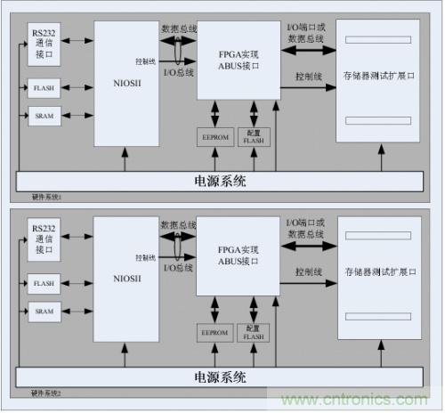在測試NAND FLASH時,測試時間長達十個小時不等。在此為提高測試效率,增加測試速度,本設計采用兩套完全一樣且獨立的硬件系統構成??赏瑫r最多測試2片NAND FLASH器件。每一個硬件系統由一個微處理器(NIOSII)加一個大容量FPGA及一個存儲器測試擴展接口(即ABUS接口)三大模塊構成。如圖3-1。RS232通信接口實現測試系統與上位機的數據交換,完成人機交互操作。電源系統產生各種合適的電壓,滿足各芯片的電源供給。