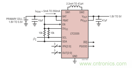 LTC3335 是一款毫微功率高效率同步降壓-升壓型轉(zhuǎn)換器,內(nèi)置了精確的庫(kù)倫計(jì)數(shù)器,提供高達(dá) 50mA 連續(xù)輸出電流。該器件具僅為 680nA 的靜態(tài)電流,可編程峰值輸入電流從低至 5mA 直至 250mA,非常適合多種低功率電池應(yīng)用,例如在可穿戴設(shè)備和 IoT 設(shè)備中見到的那些應(yīng)用。其 1.8V 至 5.5V 輸入電壓范圍和 8 個(gè) 1.8V 至 5V 的用戶可選輸出允許在輸入電壓高于、低于或等于輸出電壓時(shí),提供穩(wěn)定的輸出電源。此外,該器件集成的精確 (±5% 電池放電測(cè)量準(zhǔn)確度) 庫(kù)倫計(jì)數(shù)器可在長(zhǎng)壽命不可再充電的電池供電應(yīng)用中,對(duì)累積電池放電提供準(zhǔn)確監(jiān)視,這類應(yīng)用在很多情況下具極其平坦的電池放電曲線。典型應(yīng)用包括無線傳感器、遠(yuǎn)程監(jiān)視器和ADI的 Dust Networks SmartMesh系統(tǒng)。LTC3335 包含 4 個(gè)內(nèi)部低 RDSON MOSFET,可提供高達(dá) 90% 的效率。其他特點(diǎn)包括一個(gè)可編程放電報(bào)警門限、一個(gè)用于存取庫(kù)倫計(jì)數(shù)值和器件設(shè)定的 I2C 接口、一個(gè)電源良好輸出和 8 個(gè) 5mA 至 250mA 的可選峰值輸入電流以適合多種類型和尺寸的電池。采用耐熱增強(qiáng)型 20 引線 3mm x 4mm QFN 封裝的 LTC3335 的工作結(jié)溫范圍為 -40°C 至 +125°C。圖 2 顯示了 LTC3335 的典型應(yīng)用電路。