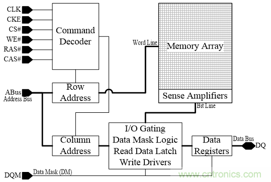 圖1顯示SDRAM的簡要功能方塊圖,行地址選通信號(CAS#)是根據預充電而設計的延遲控制信號,亦即無預充電則不必分時控制列地址選通信號(RAS#)、CAS#。差動頻率信號(CLK, CKE)的頻率是基于微處理器的工作頻率,數據屏蔽信號(DQM)對應差動頻率信號的邊緣;這些信號用于進行同步傳輸操作。對于感測放大器以及寫入驅動器的配置規劃,通常根據外部數據總線的位寬度而設計相同的數量,然而,可以導入并行存取的方法來增加存取效率,因此增加了行地址的位寬度以選擇同列不同行的感測放大器與寫入驅動器。這種方法產生了叢發模式(burst mode)以及同列存取,但并不會增加訪問速度,并且還要進行同步傳輸操作,所以需要數據緩存器。