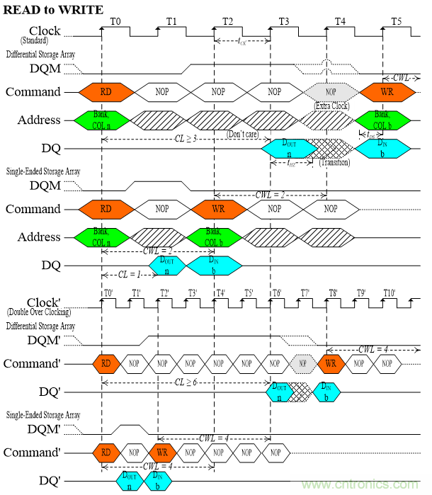 圖4用于觀察SDRAM的命令序列對于不同存取技術所發生的變化,此圖用于比較第二代與第三代技術之間的存取效率。SDRAM的命令序列有多種組合,其中讀取命令至寫入命令(READ to WRITE)最能突顯不同存取技術之間的差異。第三代技術的讀取時間(tread)很短,于是CL值可以很小,但受到差動頻率信號以及DQM信號的限制而不能等于0;另外,即使CL值等于1也還有回寫時間(trewrite),所以第三代技術要以CWL值來替換CL值。