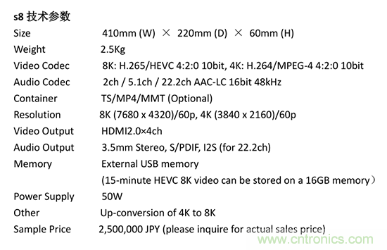 在此背景下,索喜科技研發(fā)了可最大限度使用8K超高精細高影像的媒體播放器s8。s8搭載索喜科技獨自研發(fā)的解調(diào)器LSI“SC1400A”,可對HEVC 8K影像輸入進行實時解碼,與影像數(shù)據(jù)再生相比,可以實現(xiàn)體育賽事、演唱會等的8K直播。此外,還能對H.264/MPEG-4壓縮的4K影像進行解碼處理,甚至是將4K影像提升至8K(超解像處理)。
