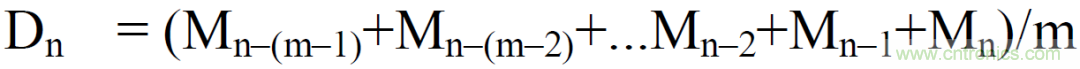 移動(dòng)平均法,用戶可設(shè)定移動(dòng)個(gè)數(shù)對(duì)電壓或電流有效值、有功功率的瞬時(shí)值(采樣數(shù)據(jù))進(jìn)行移動(dòng)平均,其原理是采集N個(gè)信號(hào)之后對(duì)這些數(shù)據(jù)求平均,其中移動(dòng)個(gè)數(shù)N可以手動(dòng)設(shè)置,移動(dòng)個(gè)數(shù)設(shè)置值越大測量值越穩(wěn)定,同樣對(duì)輸入變化的響應(yīng)速度也就越慢,該平均方法多用于信號(hào)本身存在波動(dòng)的情況,比如因負(fù)載波動(dòng)導(dǎo)致信號(hào)本身波動(dòng),就建議用移動(dòng)平均,移動(dòng)平均公式如下: