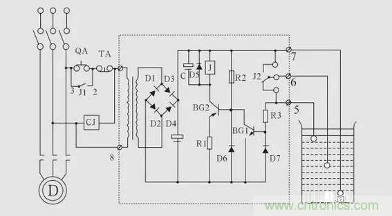 我們以這兩個電路為例,220伏電路和380伏電路接法是一樣的。一個是單相電機一個是三相電機,所以液位繼電器的線圈電壓一個是220伏一個是380伏。如圖所示1和8是液位繼電器的線圈,5、6、7是液位繼電器的高中低3個液位探頭,2和3是一組常開點,4和3是一組常閉點。