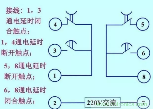 5-8腳為通電延時閉合觸點,接通電源,給了信號之后線圈得電,等到設(shè)置時間到達以后,觸點閉合;
