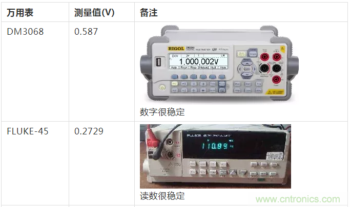 其中,讀數(shù)最高的是DM3068六位半的數(shù)字萬用表,但顯示數(shù)值也僅有0.587V,比信號源輸出的1V低了42%。