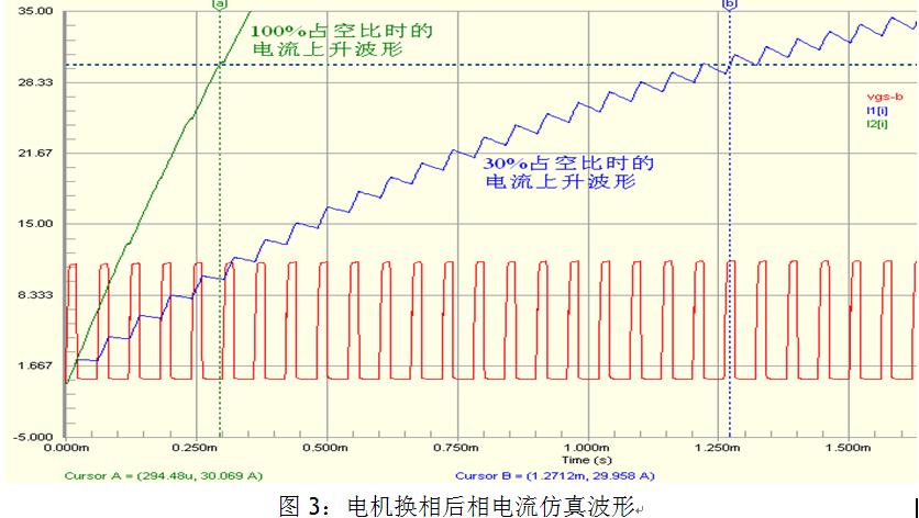 由于在低速大負(fù)載運(yùn)行時(shí),電機(jī)的旋轉(zhuǎn)反電勢很小,為了使電機(jī)的相電流不超過允許的最大值,PWM占空比通常比較小,這使得換相后新的相繞組電流上升緩慢。圖3中是電機(jī)換相時(shí)的電流仿真波形。電機(jī)兩相之間的電感為Lm=0.4mH,內(nèi)阻Rm=0.28歐姆(實(shí)際電機(jī)的參數(shù))。采用AOS(萬代半導(dǎo)體)生產(chǎn)的AOT460 MOSFET進(jìn)行仿真。MOSFET的PSPICE模型采用level3等級。由圖3中可以看出,如果PWM占空比為30%,則電流由零上升到30A需要約1.3ms。這與圖2a中實(shí)測的波形相仿。為了使換相后電流迅速上升,我們可以使換相后PWM占空比為100%來對電流進(jìn)行補(bǔ)償,直到電流上升到換相前的電流值,這樣可以使換相電流的波動(dòng)盡可能的小,時(shí)間盡可能地短。由仿真波形中I2可以看出,電流上升到30A的時(shí)間小于300us。