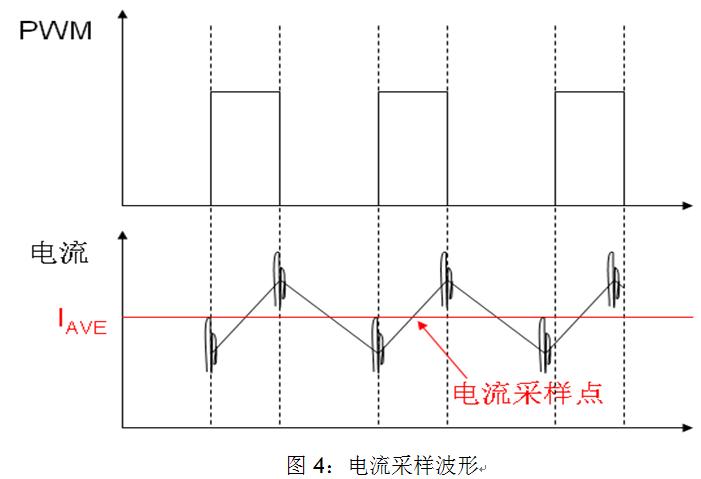 2) 能夠在PWM的開通期間特定時(shí)刻觸發(fā)A/D采樣;因?yàn)樵赑WM逆變器帶感性負(fù)載的控制系統(tǒng)中,由于系統(tǒng)的一些寄生參數(shù)導(dǎo)致PWM在開通和關(guān)斷期間電機(jī)的相線上出現(xiàn)振鈴(如圖4所示),這些振鈴會(huì)耦合到A/D采樣的回路中,因此我們應(yīng)避開在PWM開關(guān)過程中進(jìn)行A/D采樣。如果我們在PWM開通期間的中點(diǎn)觸發(fā)電流采樣,我們將會(huì)得到電流的平均值,這將有利于我們對電流補(bǔ)償?shù)目刂啤?