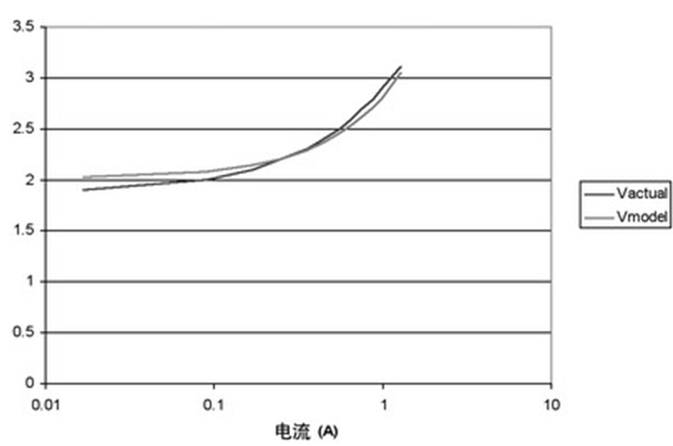 圖 1 顯示了典型 InGaAlP LED(黃色和琥珀紅)的正向電壓特性。也可以把 LED 作為電壓源與電阻串聯建模,并查看模型與實際測量之間的良好關聯性。電壓源有一個負的溫度系數,當結溫上升時,電壓源的正向電壓會發生負的變化。InGaAlP LED的系數在-3.0mV/K~-5.2mV/K 之間,而 InGaN LED(藍色、綠色和白色)的系數則在-3.6mV/K~-5.2mV/K 之間。這就是為什么不能直接對 LED 進行并聯的原因。產生熱量最多的器件需要更大的電流,更大的電流會產生更多的熱量,進而引起散熱失控。