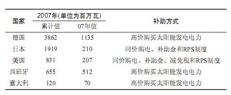 在太陽能發(fā)電上領(lǐng)先的歐洲,主要采用電力公司以高于普通電力的價格購買太陽能發(fā)電系統(tǒng)所發(fā)的電力。而美國和日本則采用與普通電力相同的價格購買太陽能發(fā)電系統(tǒng)所發(fā)的電力。美、日還補助用戶購置太陽能發(fā)電系統(tǒng)。下表列出了幾個先進國家的太陽能發(fā)電的發(fā)電量(單位為百萬瓦)和補助措施。