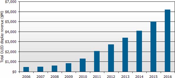 圖一 2006-2016 OLED面板出貨金額預(yù)測(單位:百萬美元)