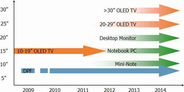 隨著技術(shù)進(jìn)步,DisplaySearch預(yù)估AMOLED將進(jìn)一步朝中大尺寸方向發(fā)展。筆記本計算機將是AMOLED廠商下一個關(guān)注的應(yīng)用方向,我們估計自2010年年中,廠商將有機會將AMOLED應(yīng)用在筆記本計算機上,而采用AMOLED面板上網(wǎng)本將有機會于2010年底開始量產(chǎn)。在TV方面,我們預(yù)期2010年底將會有大于20寸AMOLED TV被生產(chǎn),同時預(yù)期2011年大于30寸AMOLED TV 將會進(jìn)入市場中。