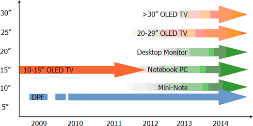 隨著技術(shù)進步,DisplaySearch預估AMOLED將進一步朝中大尺寸方向發(fā)展。筆記本計算機將是AMOLED廠商下一個關注的應用方向,我們估計自2010年年中,廠商將有機會將AMOLED應用在筆記本計算機上,而采用AMOLED面板上網(wǎng)本將有機會于2010年底開始量產(chǎn)。在TV方面,我們預期2010年底將會有大于20寸AMOLED TV被生產(chǎn),同時預期2011年大于30寸AMOLED TV 將會進入市場中。
