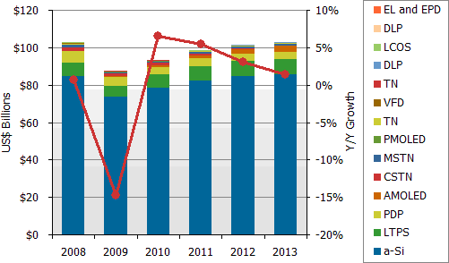 圖一 : 2008-2013全球平面顯示器按不同技術別出貨金額預估與年成長率(單位:百萬美金)