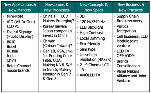 在接下來的十年將有八種因素主導著平面顯示器的成長: 新應用與新市場、新廠商與新制程、新潮流與新規格、新商業模式與新實踐方式(如圖二)。其中有許多項目是來自于各平面顯示器廠商在2008年底與2009年初這波景氣衰退中所得到的啟示;需求下滑與競爭日益激烈迫使廠商不斷的尋找新的策略、新的市場與新的解決方法,同時推動平面顯示產業不斷地前進。
