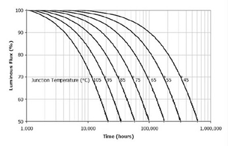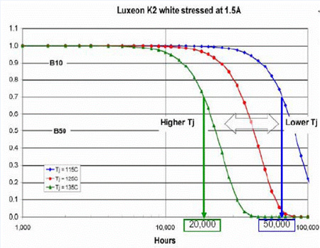 當(dāng)結(jié)溫從115℃提高到135℃,就會(huì)使壽命從50,000小時(shí)降低到20,000小時(shí)。其他各家公司的光衰曲線應(yīng)當(dāng)可以向原廠索取。