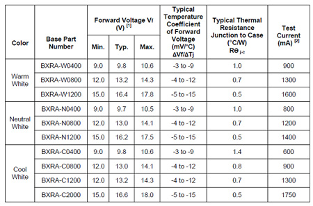 假定對LED以Io恒流供電,在結(jié)溫為T1時(shí),電壓為V1,而當(dāng)結(jié)溫升高為T2時(shí),整個(gè)伏安特性左移,電流Io不變,電壓變?yōu)閂2。這兩個(gè)電壓差被溫度去除,就可以得到其溫度系數(shù),以mV/oC表示。對于普通硅二極管,這個(gè)溫度系數(shù)大約為-2mV/oC。但是LED大多數(shù)不是用硅材料制成的,所以它的溫度系數(shù)也要另外去測定。幸好各家LED廠家的數(shù)據(jù)表中大多給出了它的溫度系數(shù)。例如對于Cree公司的XLamp7090XR-E大功率LED,其溫度系數(shù)為-4mV/oC。要比普通硅二極管大2倍。至于美國普瑞的陣列LED(BXRA)就給出了更為詳細(xì)的數(shù)據(jù)。