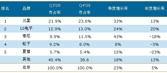 LG為2009年第四季的全球電視市場銷售金額的第二名,而在前五名之中LG是增長最快的。LG的2009年全年銷售金額占有率達(dá)到了13.2%,較2008年整整增長了2個(gè)百分點(diǎn)。