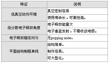 BSD是應用彈道電子釋放特性構成冷陰極電子源,它的電子釋放原理不同于傳統FED。表2是BSD代表性特徵,由表2可知BSD具有低電壓驅動、低真空動作環境、不需集束電極、低制作成本等特性,尤其是玻璃基板與500°C低溫濕制程(wetprocess),更可大幅降低制作成本。