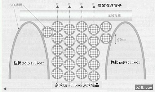 BSD是將silicon奈米結晶化形成鎖鍊狀結構,藉此使電子呈彈道狀移動,一般將此現象稱為彈道電子輸送。圖1是BSD電子源的動作機制說明圖,基本上它是在柱狀polysilicon之間形成電子drift層,polysilicon與奈米結晶silicon混合的systemunit稱為NPS層(NanocrystallinePoly-Siliconlayer),雖然NPS層是利用陽極氧化技術制成,不過在polysilicon的結晶粒界的glen部位會產生快速反應,因此polysilicon結晶粒的表面,支配性形成奈米結晶silicon,使得NPS層內殘留的silicon結晶粒比奈米結晶silicon多,該殘留的柱狀polysilicon可幫助散熱,進而提高冷陰極的電子熱傳導穩定性,所以BSD釋放電子時幾乎不會產生閃爍噪訊(flickernoise)。