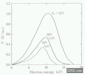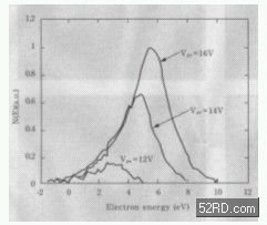 如圖2所示的能量分佈峰值位置,亦即電子數最多的能量,理論上是最大能量的60%約在10eV處,即使如此若與其它種類的電子源比較時,很明顯的是BSD具備很高的能量。另一個特殊現象是該能量分佈與施加電壓具有依存性,也就是說隨著VPS的增加,峰值能量Emax與最大能量會逐漸移至highenergyside,這意味著BSD釋放的電子在NPS層幾乎未散亂,如果在低溫環境下測試釋放電子的能量分佈,上述彈道電子釋放更加明顯,而且能量分佈幅度更加狹窄(峰值能量EP朝最大能量Emax方向移動)。