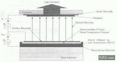 而BSD的動作原理是利用固體中的電子在近乎真空環境加速移動。該物性是由硅結晶奈米(nano;1nano=10-12m)結晶化形成鍊鎖結構,由于鍊鎖結構能垂直發射電子,因此利用電子該撞擊前方涂有螢光體的透明基板產生影像。奈米技術制成的BSD可以有效解決平面顯示器常見的問題,同時還具備低成本、制程簡單、可大型化等優點,因此它的應用受到相關業者高度重視